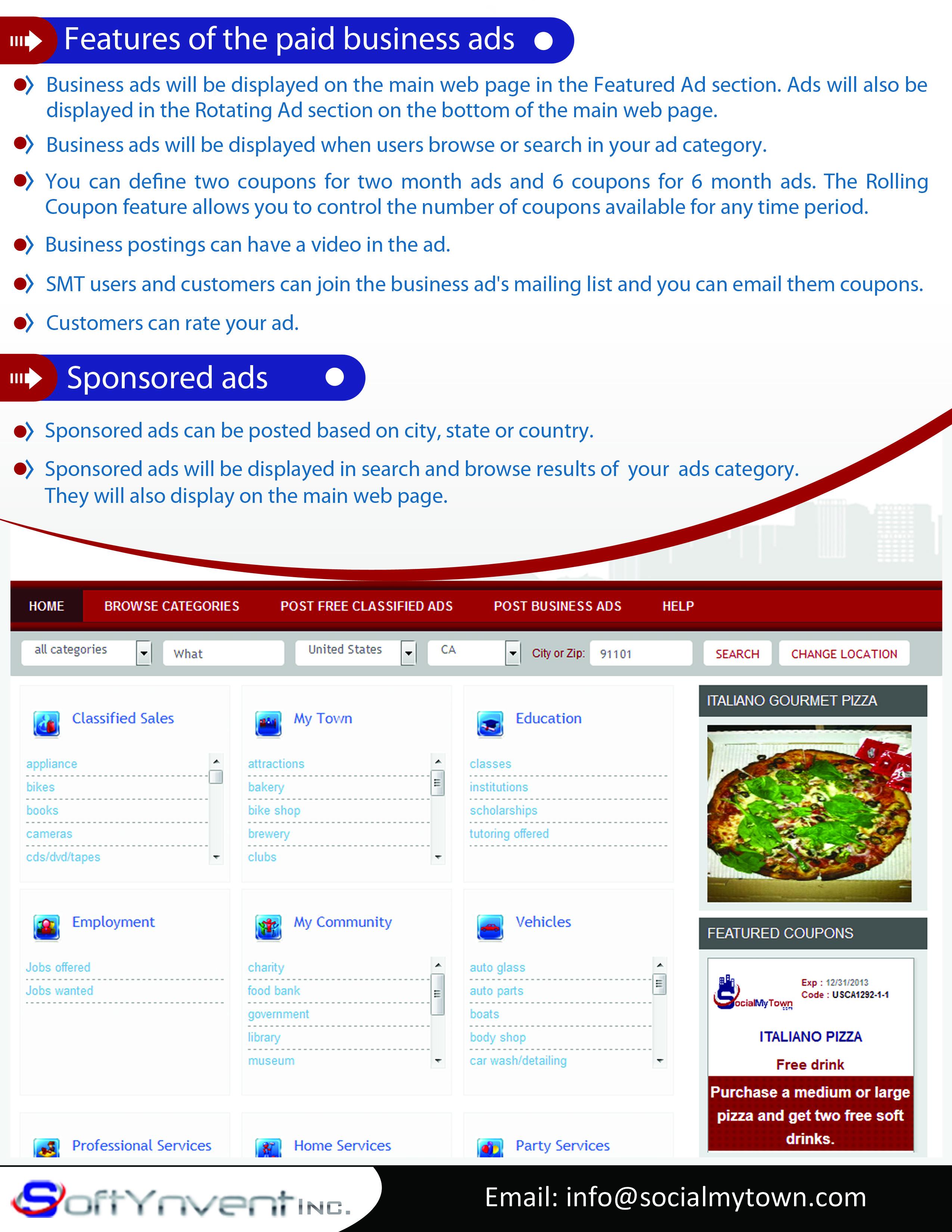 SocialMyTown.com is the most efficient and affordable online advertising platform for your business. The age of spending thousands of dollars to promote coupons and special offerings is over. With SocialMyTown.com, all you need to do is post your ad, define your coupon and watch your business grow.